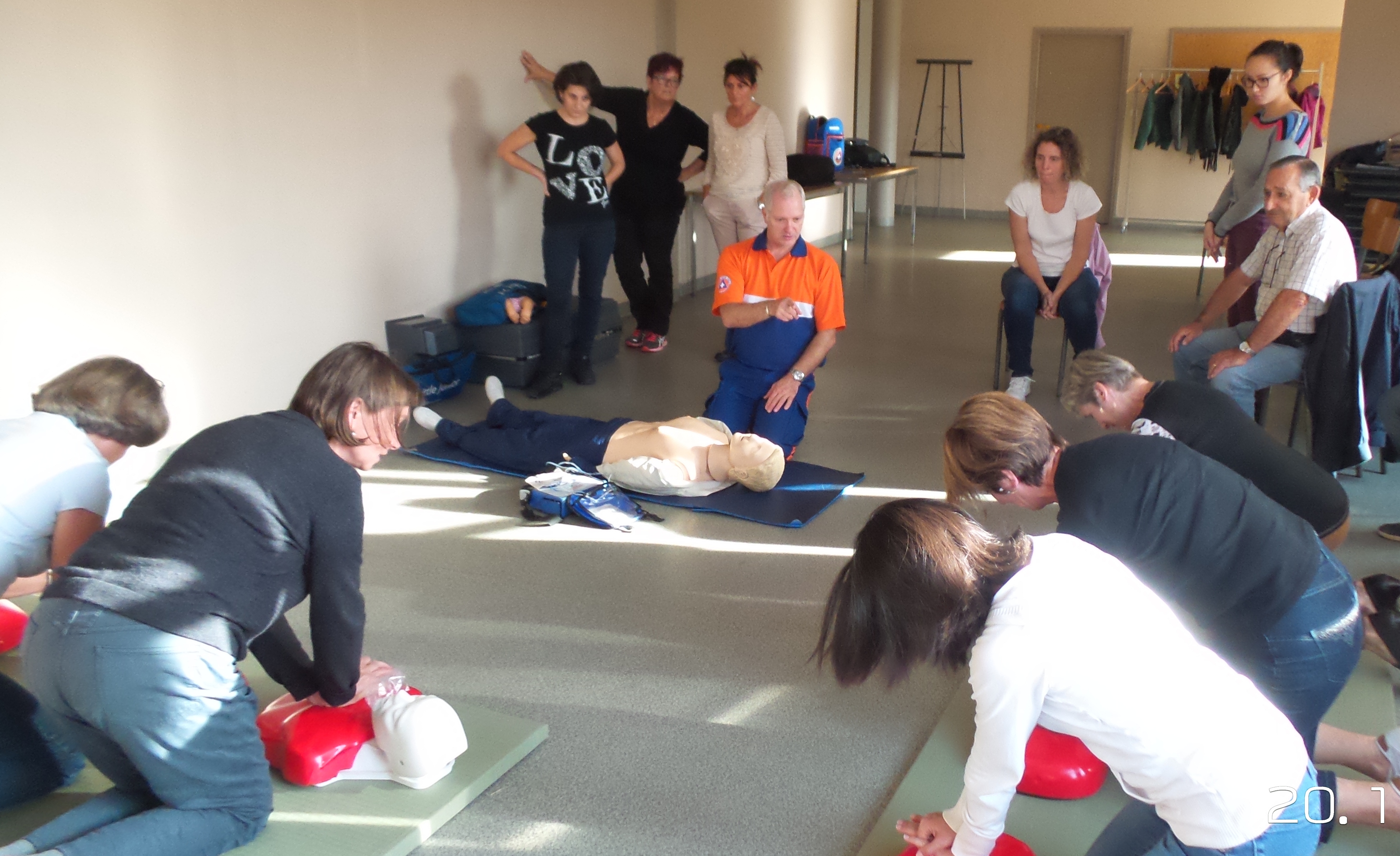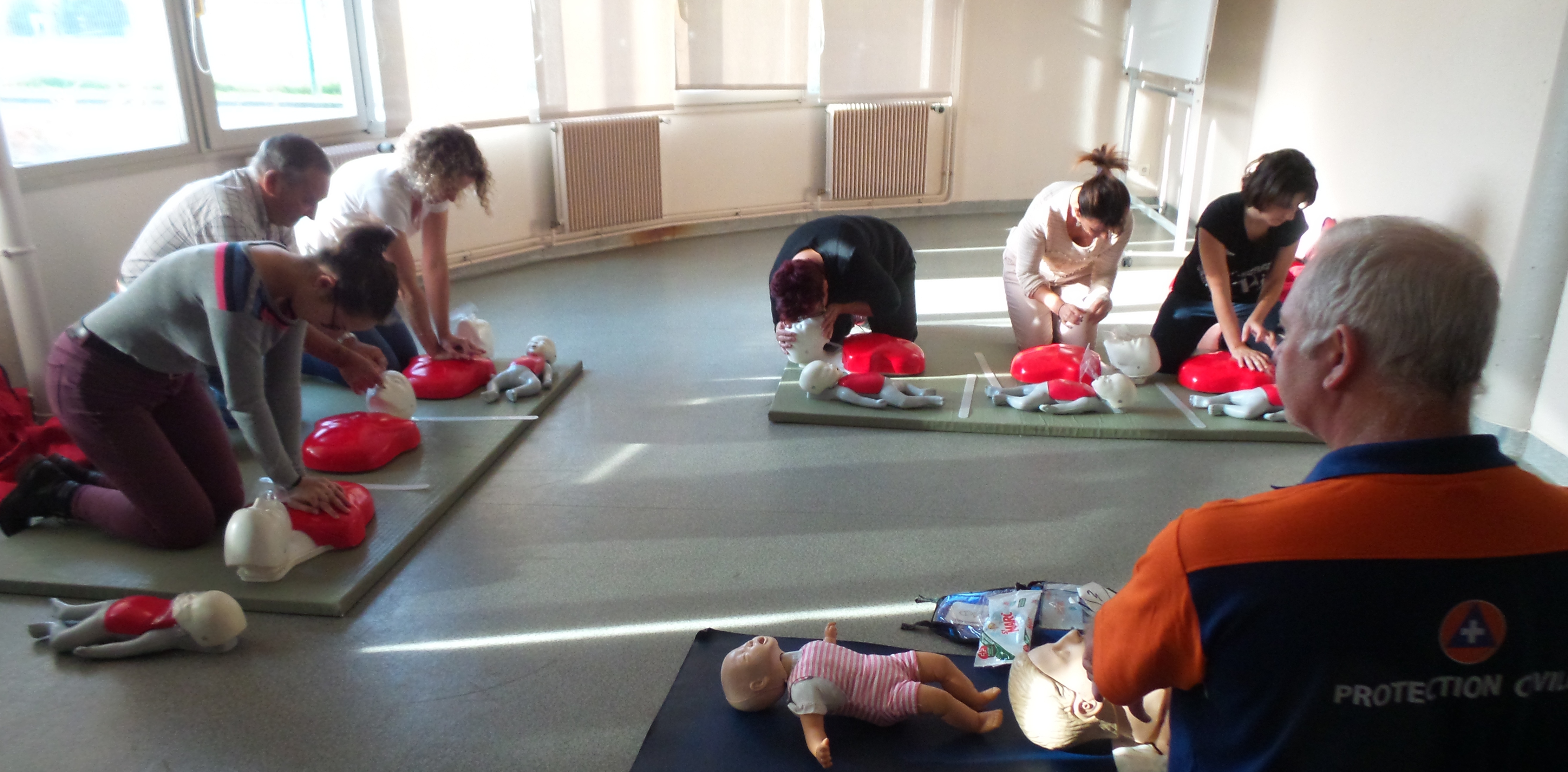 Ce 21 octobre 2017, les 15 personnes présentes ont appris et mis en pratique les consignes et les gestes de premiers secours sur des mannequins sous le contrôle du formateur de la Protection civile. En fin de séance certains stagiaires envisagent de suivre une formation de secouriste et de s’engager comme bénévole à la protection civile.