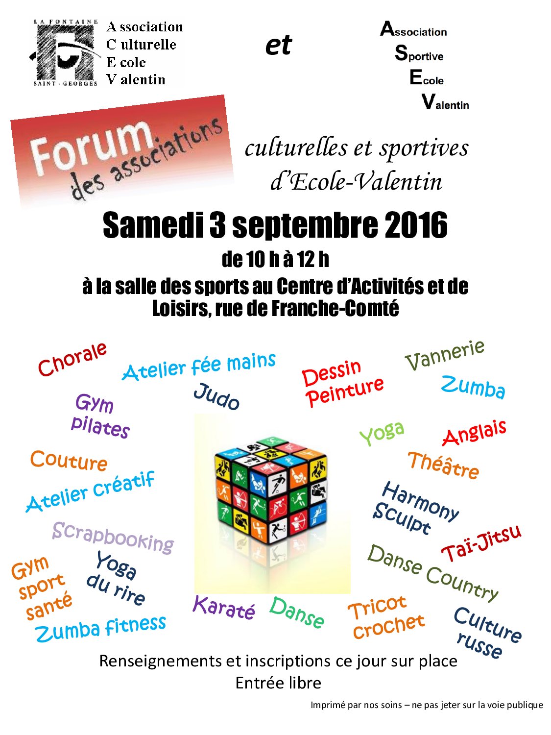 Vous recherchez une activité sportive, créative ou culturelle pour la rentrée? Venez nous rencontrer au forum des associations le samedi 3 septembre à la salle de sport du CAL de 10 h à 12 h et demander des renseignements ou vous inscrire auprès de tous les responsables d’activités ou professeurs des associations sportive et culturelle d’ECOLE-VALENTIN.