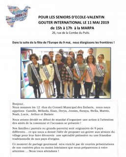 Comme vous le découvrirez sur les photos ci-jointes, samedi 12 mai, le Conseil Municipal des Enfants ont proposé un « goûter international » aux seniors de la commune et évidemment aux résidents des Valentines puisque cela s’est passé dans les locaux de la Marpa .