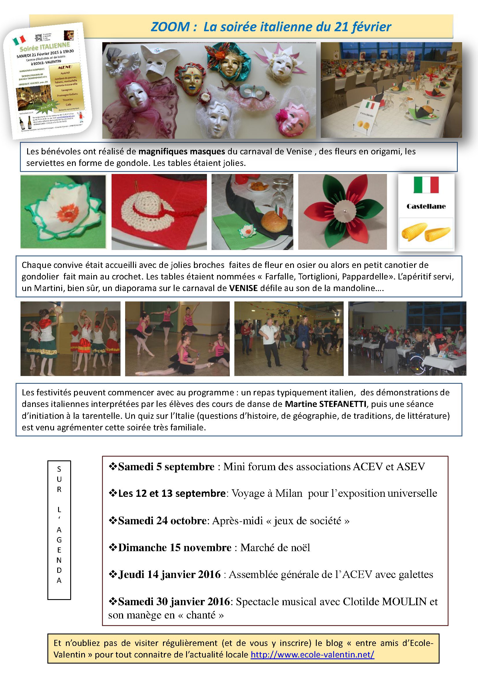 Vous y trouverez quelques informations importantes telles que la date du mini-forum pour les inscriptions à vos activités de la rentrée, une proposition de voyage à Milan pour l’exposition universelle MILANO 2015 à des conditions très intéressantes, les activités de l’année écoulée et celles qui sont à venir…