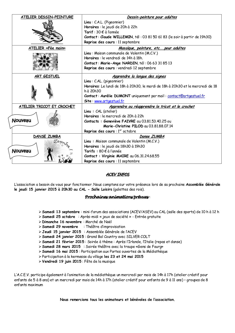 Tous renseignements et inscriptions lors du forum des associations le samedi 13 septembre de 10h à 12h à la salle des sports (sous le CAL rue de Franche Comté à Ecole-Valentin)